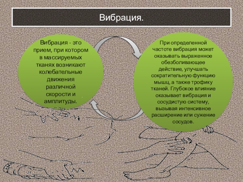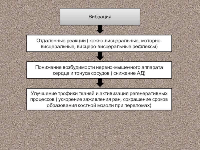 При определенной частоте вибрация может оказывать выраженное обезболивающее действие, улучшать сократительную функцию мышц, а также трофику тканей. Глубокое влияние оказывает вибрация и сосудистую систему, вызывая интенсивное расширение или сужение сосудов.