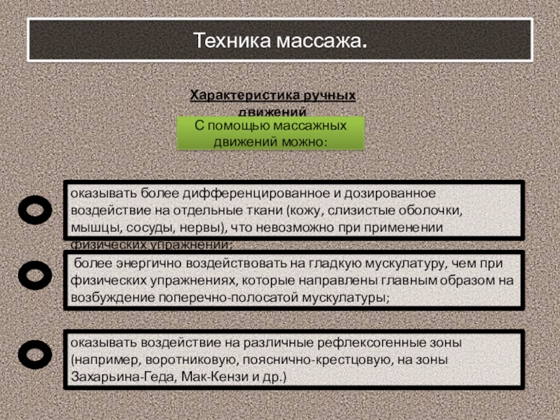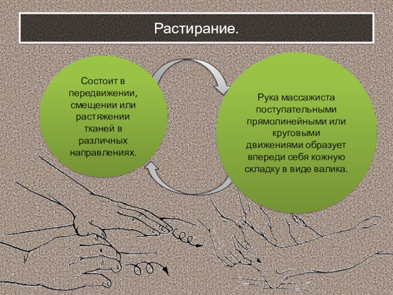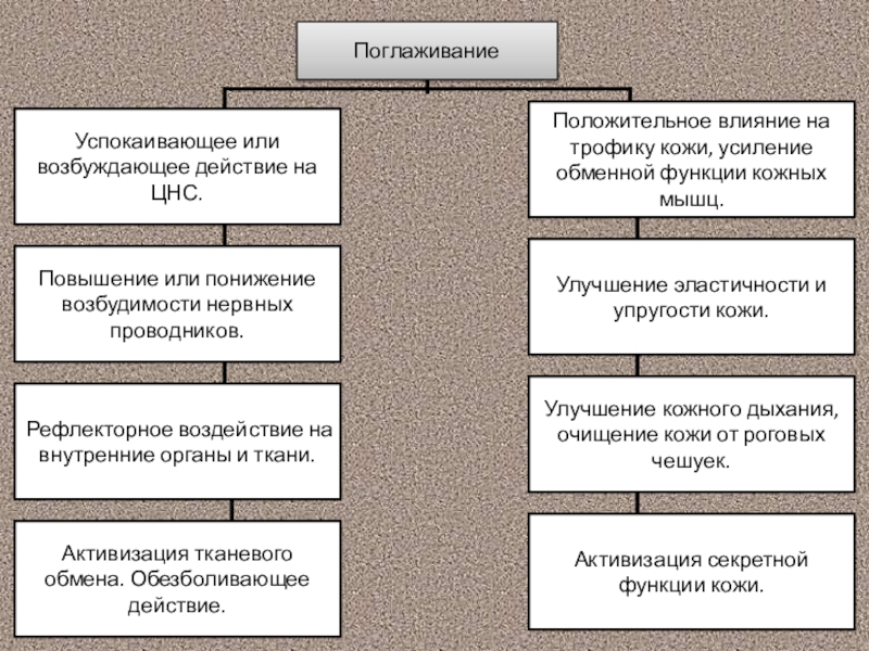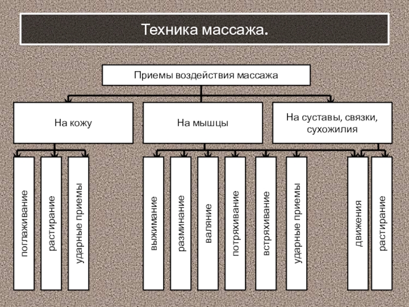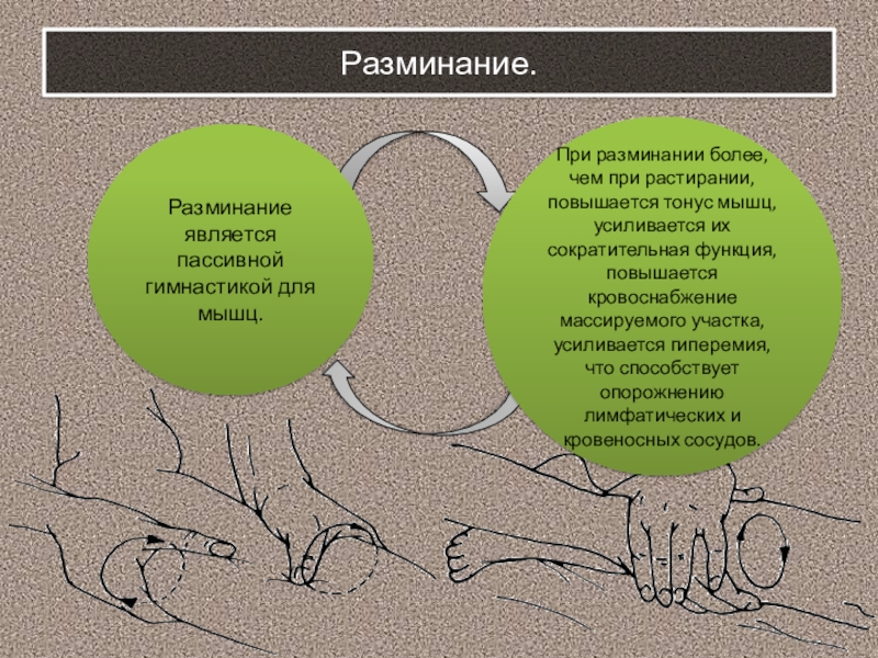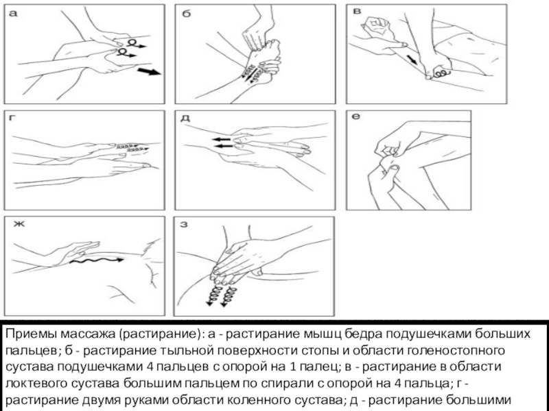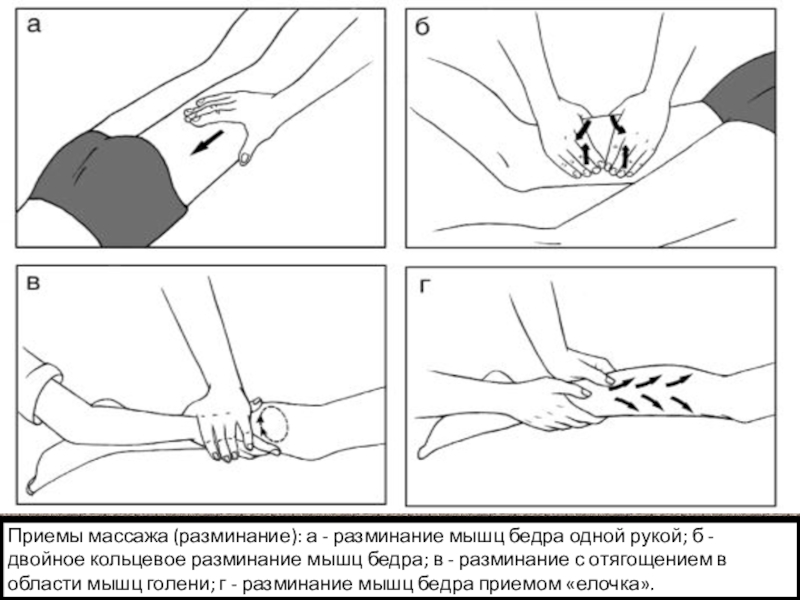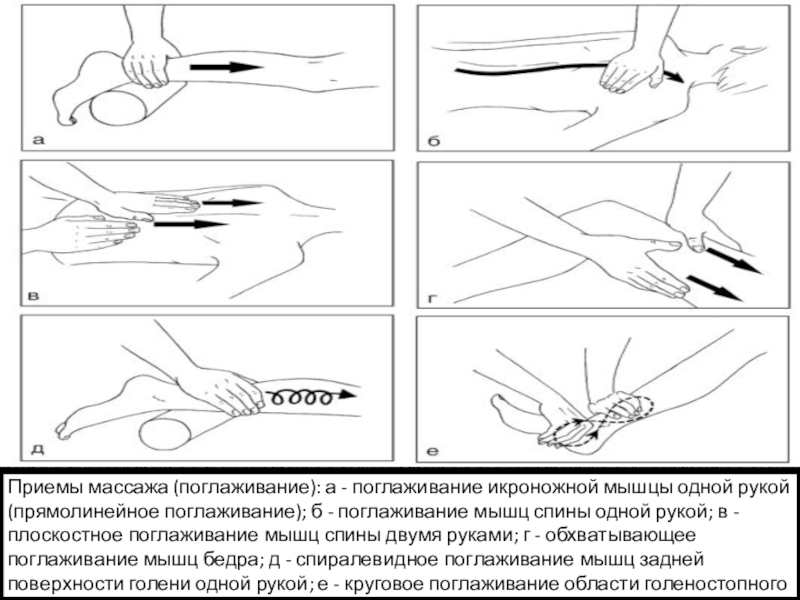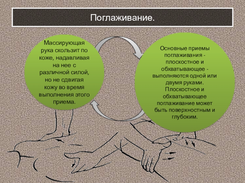 Основные приемы поглаживания - плоскостное и обхватывающее - выполняются одной или двумя руками. Плоскостное и обхватывающее поглаживание может быть поверхностным и глубоким.