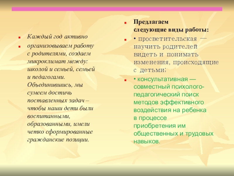 • консультативная — совместный психолого-педагогический поиск методов эффективного воздействия на ребенка в процессе приобретения им общественных и трудовых навыков.
