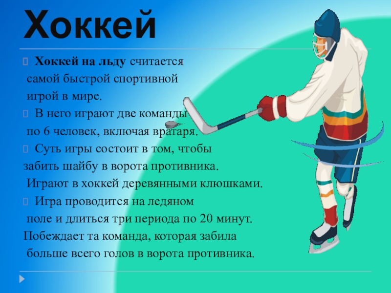 ХоккейХоккей на льду считается самой быстрой спортивной игрой в мире.В него играют две команды по 6 человек,