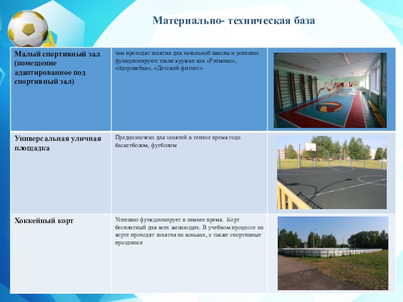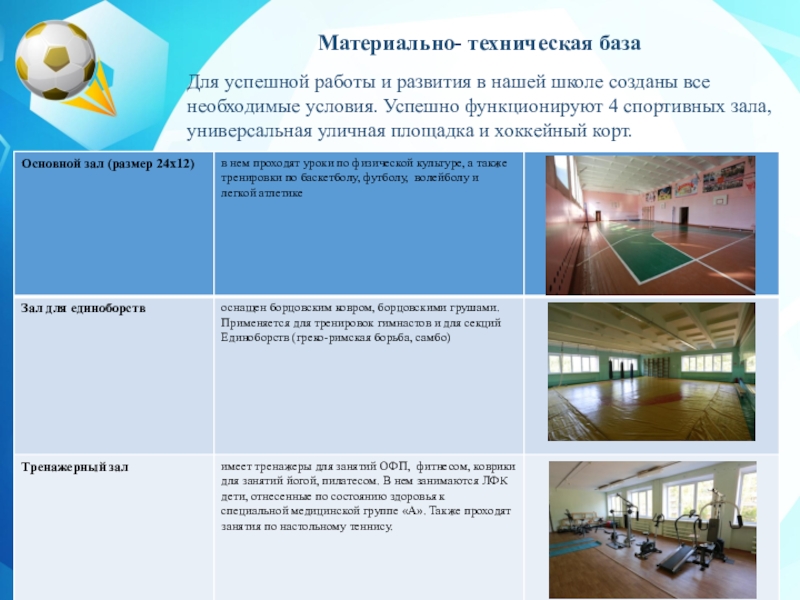 все необходимые условия. Успешно функционируют 4 спортивных зала, универсальная уличная площадка и хоккейный корт.