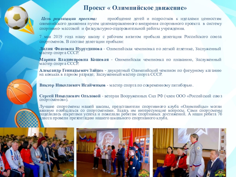 Лучшие спортсмены нашей школы, представители спортивного клуба «Олимпийцы» могли вживую пообщаться со спортсменами. Задать им интересующие вопросы. Сами спортсмены поделились секретами успеха и пожелали ребятам спортивных достижений. А наши ребята 7б класса провели презентацию нашего школьного спортивного клуба.
