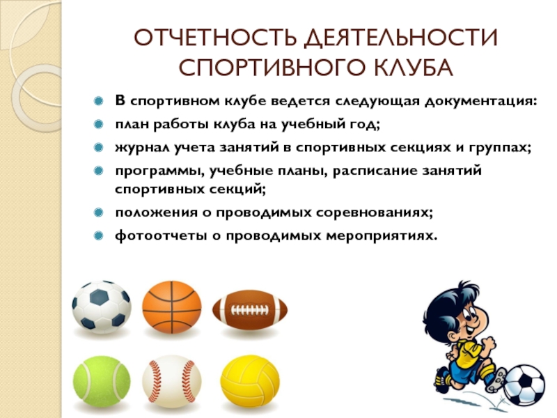 ОТЧЕТНОСТЬ ДЕЯТЕЛЬНОСТИ СПОРТИВНОГО КЛУБА В спортивном клубе ведется следующая документация:план работы клуба на учебный год;журнал учета