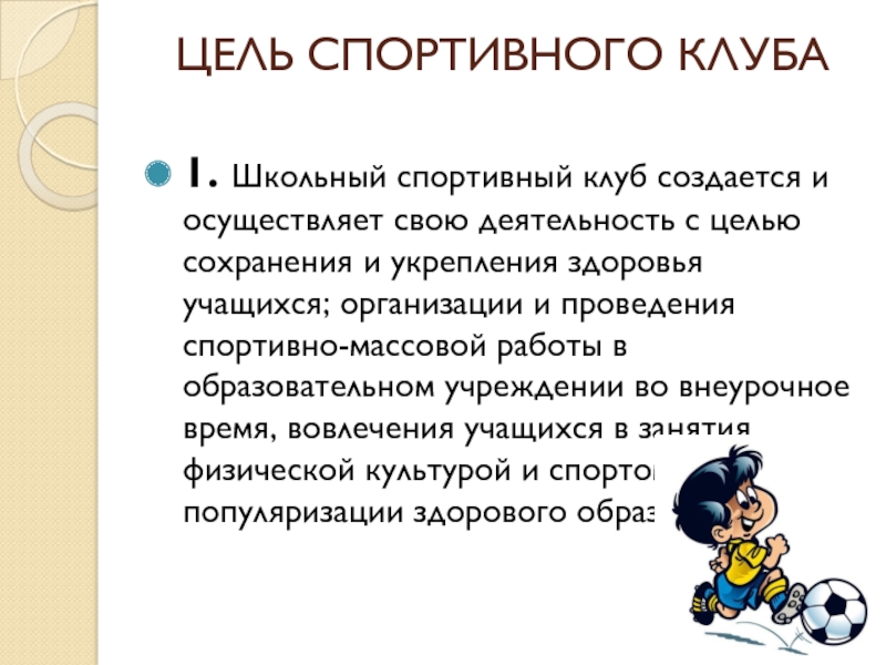 ЦЕЛь СПОРТИВНОГО КЛУБА 1. Школьный спортивный клуб создается и осуществляет свою деятельность с целью сохранения и укрепления