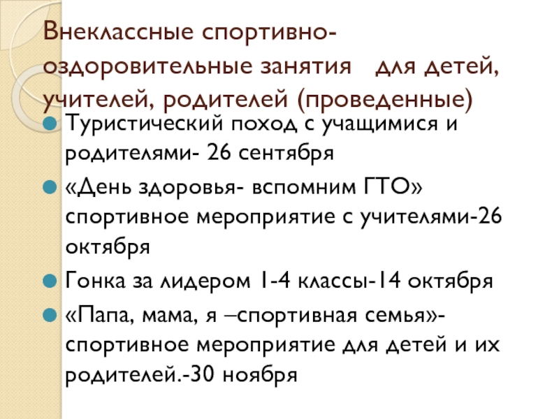 Слайд 12 Внеклассные спортивно-оздоровительные занятия   для детей, учителей, родителей (проведенные)