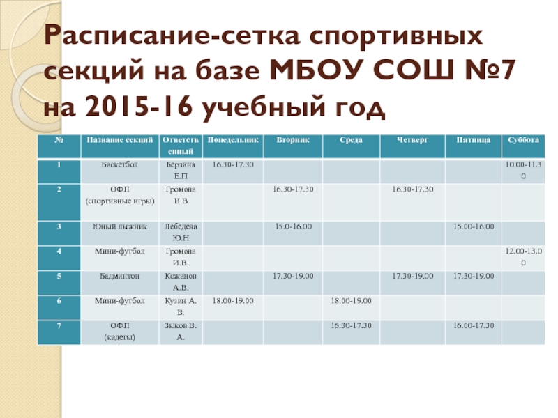 Слайд 6  Расписание-сетка спортивных секций на базе МБОУ СОШ №7 на 2015-16 учебный