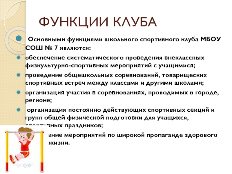ФУНКЦИИ КЛУБА Основными функциями школьного спортивного клуба МБОУ СОШ № 7 являются:обеспечение систематического проведения внеклассных физкультурно-спортивных мероприятий с
