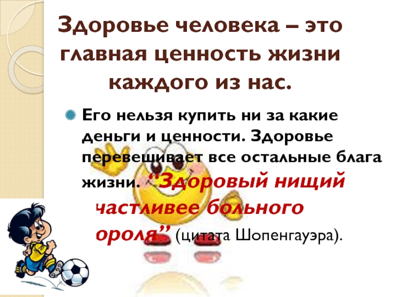 купить ни за какие деньги и ценности. Здоровье перевешивает все остальные блага жизни. “Здоровый нищий счастливее больного короля” (цитата Шопенгауэра).