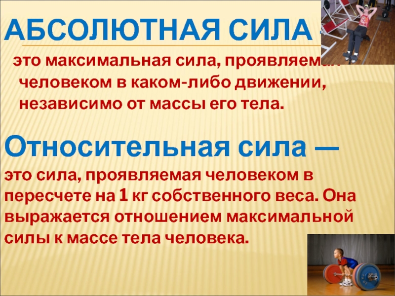 это сила, проявляемая человеком в пересчете на 1 кг собственного веса. Она выражается отношением максимальной силы к массе тела человека.