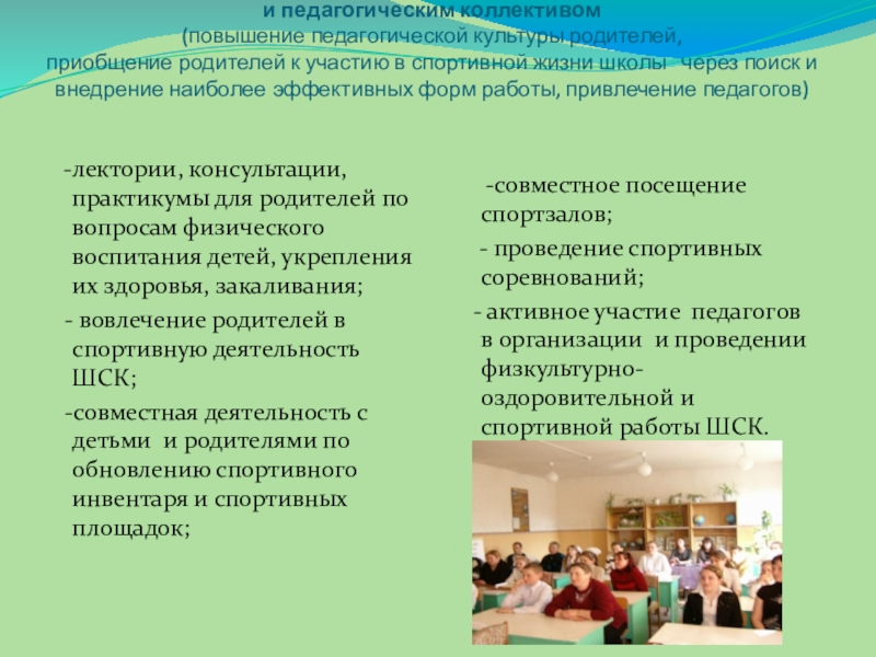 - активное участие педагогов в организации и проведении физкультурно-оздоровительной и спортивной работы ШСК.