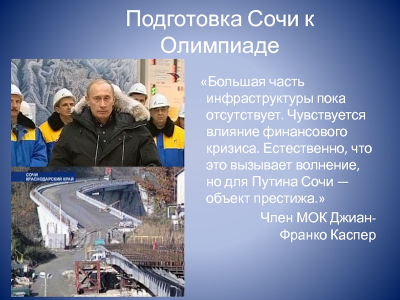 влияние финансового кризиса. Естественно, что это вызывает волнение, но для Путина Сочи — объект престижа.»