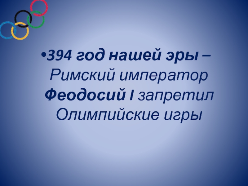 Слайд 7394 год нашей эры – Римский император Феодосий I запретил Олимпийские
