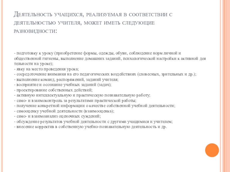 - подготовку к уроку (приобретение формы, одежды, обуви, соблюдение норм личной и общественной гигиены, выполнение домашних заданий, психологической настройки к активной деятельности на уроке);