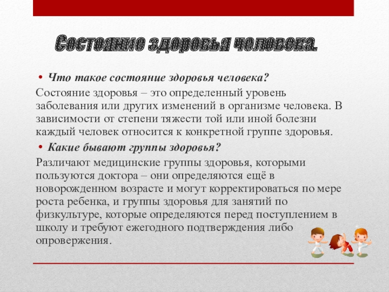 Состояние здоровья человека.Что такое состояние здоровья человека? Состояние здоровья – это определенный уровень заболевания или других изменений в организме человека. В зависимости от степени тяжести той или иной болезни каждый человек относится к конкретной группе здоровья.