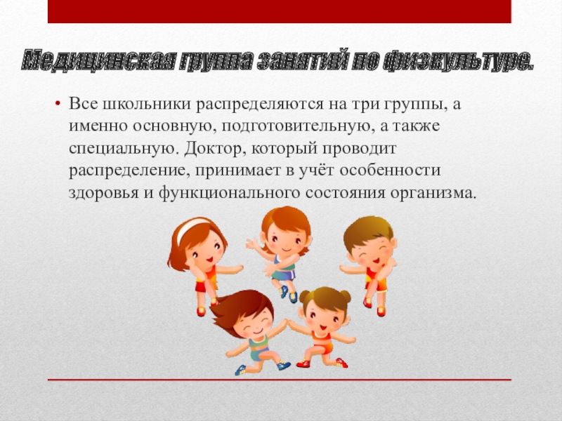 Медицинская группа занятий по физкультуре.Все школьники распределяются на три группы, а именно основную, подготовительную, а также специальную.