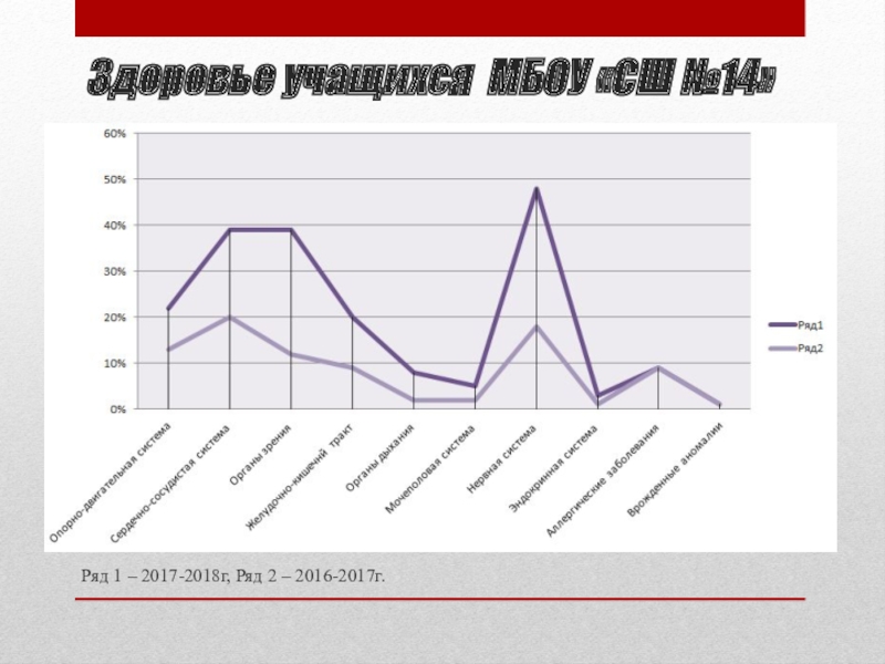 Здоровье учащихся МБОУ «СШ №14» Ряд 1 – 2017-2018г, Ряд 2 – 2016-2017г.
