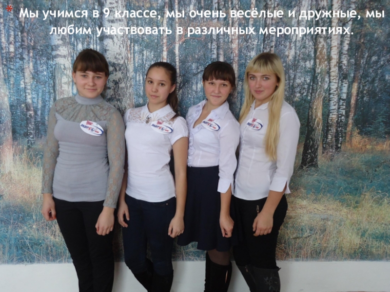 Мы учимся в 9 классе, мы очень весёлые и дружные, мы любим участвовать в различных мероприятиях.