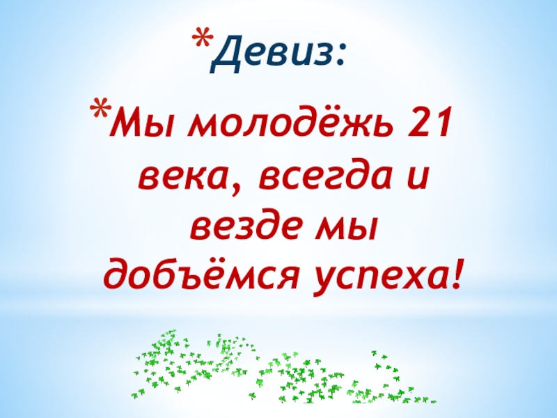 Девиз:Мы молодёжь 21 века, всегда и везде мы добъёмся успеха!