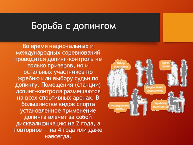 только призеров, но и остальных участников по жребию или выбору судьи по допингу. Помещения (станции) допинг-контроля размещаются на всех спортивных аренах. В большинстве видов спорта установленное применение допинга влечет за собой дисквалификацию на 2 года, а повторное — на 4 года или даже навсегда.