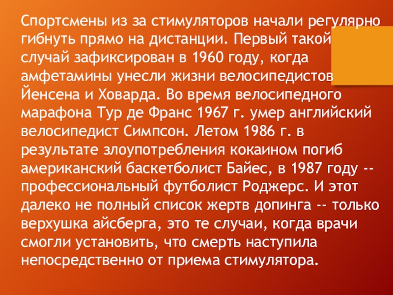 такой случай зафиксирован в 1960 году, когда амфетамины унесли жизни велосипедистов Йенсена и Ховарда. Во время велосипедного марафона Тур де Франс 1967 г. умер английский велосипедист Симпсон. Летом 1986 г. в результате злоупотребления кокаином погиб американский баскетболист Байес, в 1987 году -- профессиональный футболист Роджерс. И этот далеко не полный список жертв допинга -- только верхушка айсберга, это те случаи, когда врачи смогли установить, что смерть наступила непосредственно от приема стимулятора.