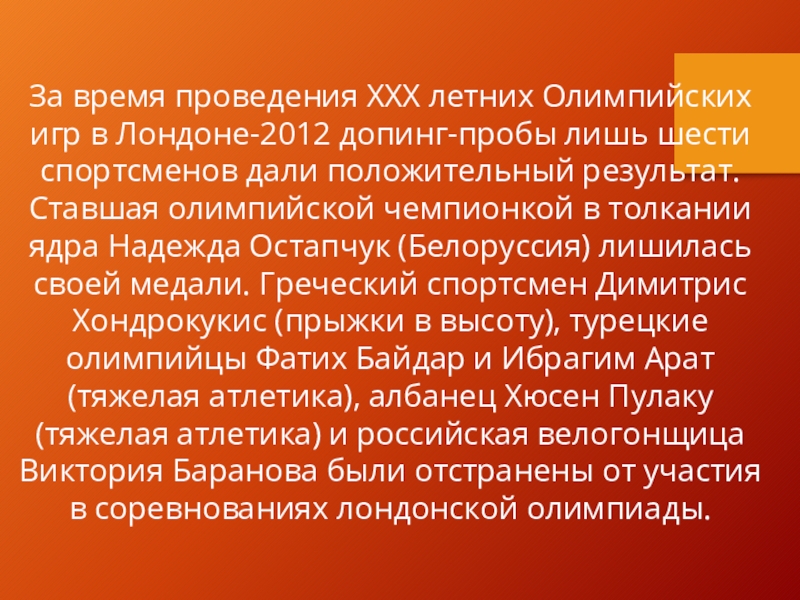 Слайд 8За время проведения XXX летних Олимпийских игр в Лондоне-2012 допинг-пробы лишь