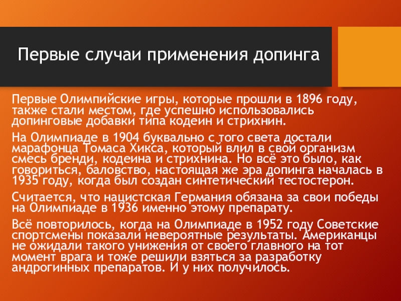 На Олимпиаде в 1904 буквально с того света достали марафонца Томаса Хикса, который влил в свой организм смесь бренди, кодеина и стрихнина. Но всё это было, как говориться, баловство, настоящая же эра допинга началась в 1935 году, когда был создан синтетический тестостерон.