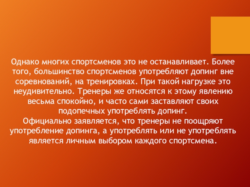 Слайд 17Однако многих спортсменов это не останавливает. Более того, большинство спортсменов употребляют
