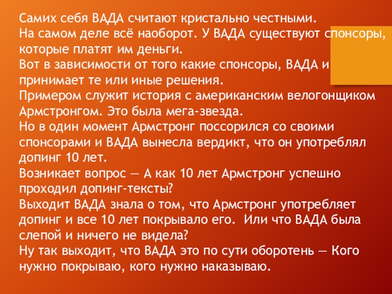 Слайд 12Самих себя ВАДА считают кристально честными.