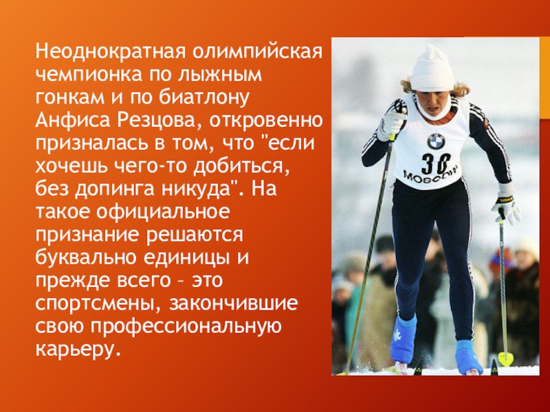 Слайд 7Неоднократная олимпийская чемпионка по лыжным гонкам и по биатлону Анфиса Резцова,
