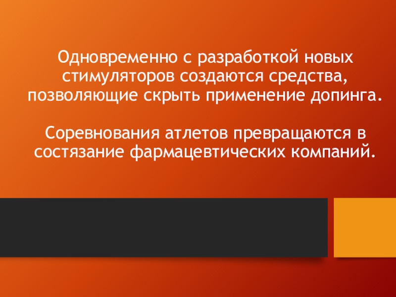 Слайд 9Одновременно с разработкой новых стимуляторов создаются средства, позволяющие скрыть применение допинга.