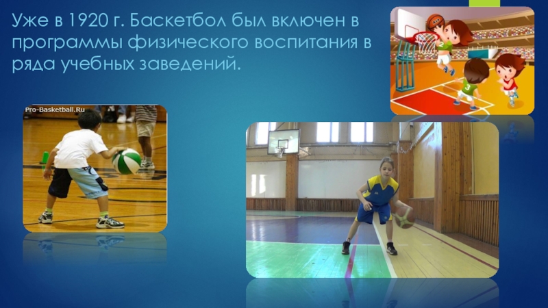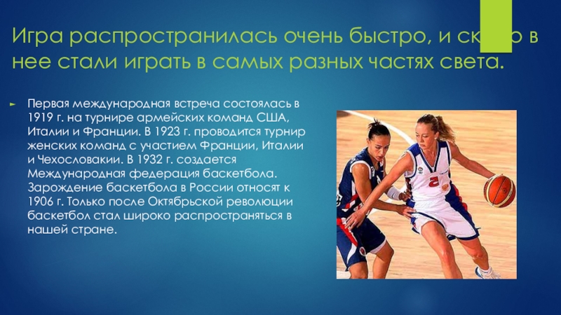 Первая международная встреча состоялась в 1919 г. на турнире армейских команд США, Италии и Франции. В 1923 г. проводится турнир женских команд с участием Франции, Италии и Чехословакии. В 1932 г. создается Международная федерация баскетбола. Зарождение баскетбола в России относят к 1906 г. Только после Октябрьской революции баскетбол стал широко распространяться в нашей стране.