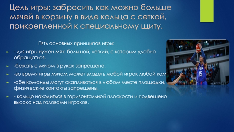 - кольцо находиться в горизонтальной плоскости и подвешено высоко над головами игроков.