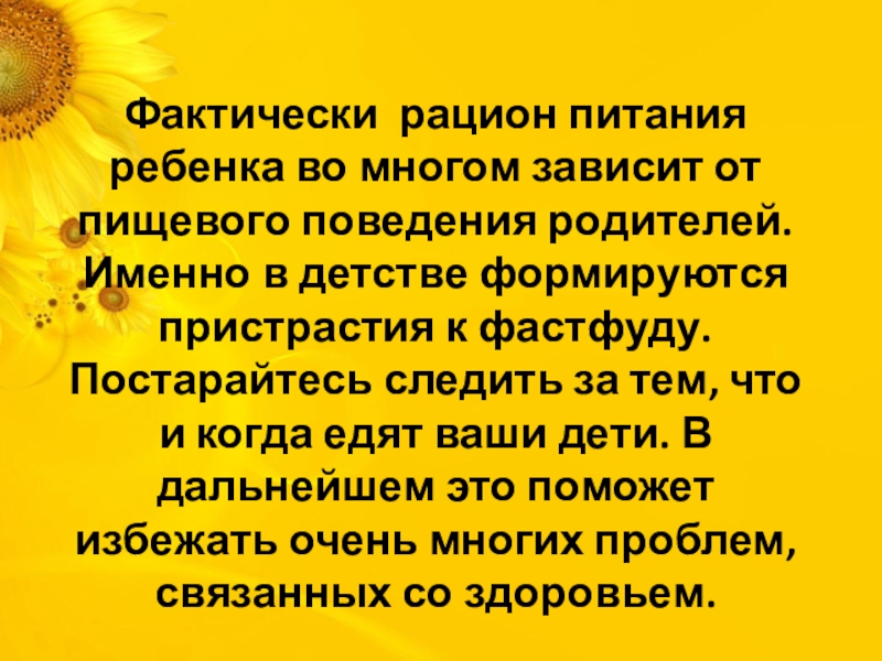 Слайд 65Фактически рацион питания ребенка во многом зависит от пищевого поведения родителей.