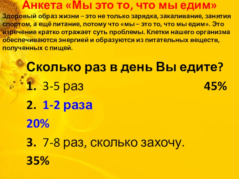 не только зарядка, закаливание, занятия спортом, а ещё питание, потому что «мы – это то, что мы едим». Это изречение кратко отражает суть проблемы. Клетки нашего организма обеспечиваются энергией и образуются из питательных веществ, полученных с пищей.