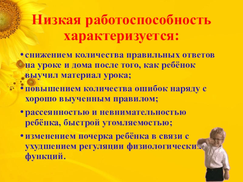 рассеянностью и невнимательностью ребёнка, быстрой утомляемостью;