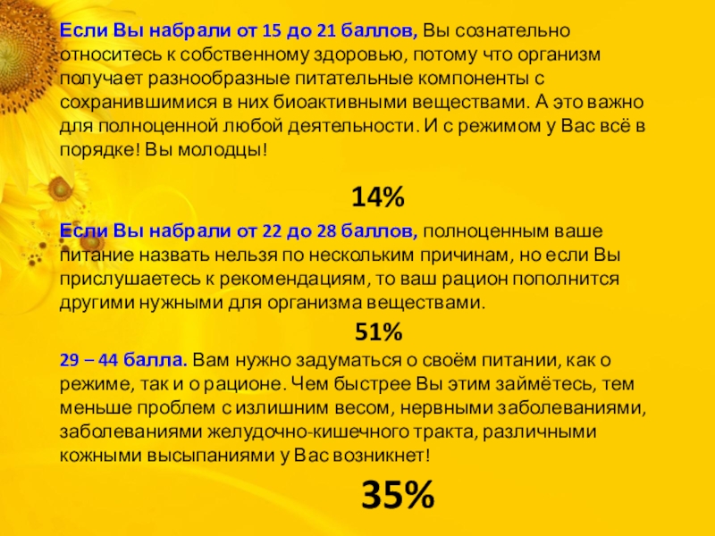 Если Вы набрали от 22 до 28 баллов, полноценным ваше питание назвать нельзя по нескольким причинам, но если Вы прислушаетесь к рекомендациям, то ваш рацион пополнится другими нужными для организма веществами.