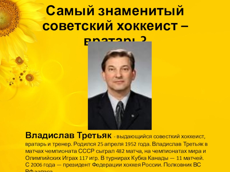 Слайд 69Самый знаменитый советский хоккеист – вратарь?