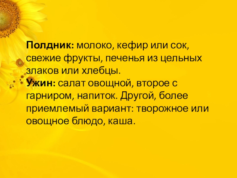 Слайд 63Полдник: молоко, кефир или сок, свежие фрукты, печенья из цельных злаков или