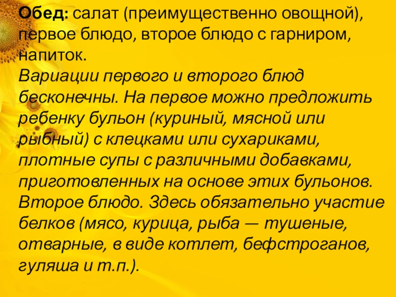Слайд 62Обед: салат (преимущественно овощной), первое блюдо, второе блюдо с гарниром, напиток.