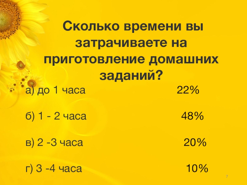Слайд 7 Сколько времени вы затрачиваете на приготовление домашних заданий?