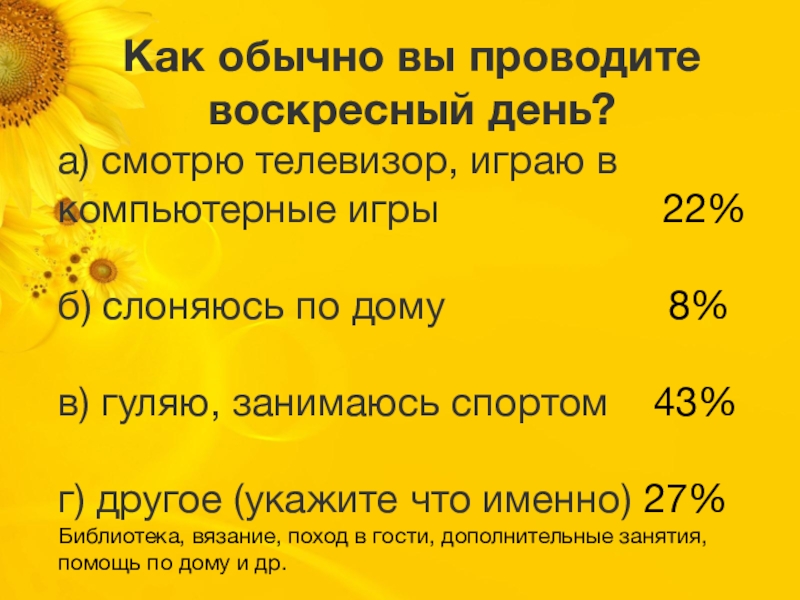 Библиотека, вязание, поход в гости, дополнительные занятия, помощь по дому и др.