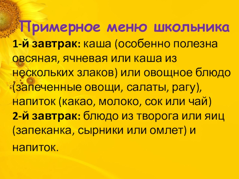 нескольких злаков) или овощное блюдо (запеченные овощи, салаты, рагу), напиток (какао, молоко, сок или чай)