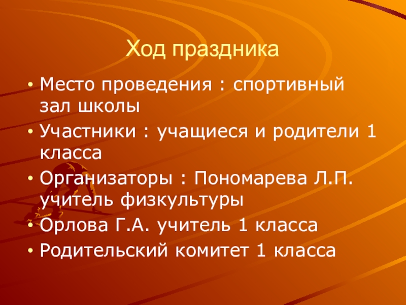 Ход праздникаМесто проведения : спортивный зал школыУчастники : учащиеся и родители 1 классаОрганизаторы : Пономарева Л.П. учитель