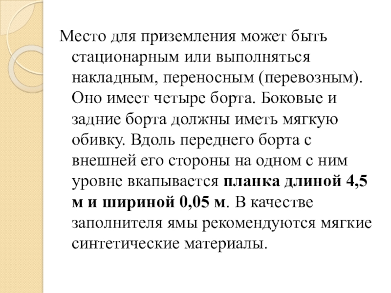 Слайд 18Место для приземления может быть стационарным или выполняться накладным, переносным (перевозным).