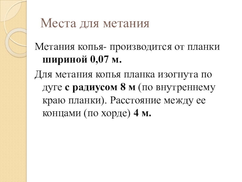 метания копья планка изогнута по дуге с радиусом 8 м (по внутреннему краю планки). Расстояние между ее концами (по хорде) 4 м.