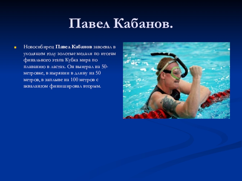 Павел Кабанов.Новосибирец Павел Кабанов завоевал в уходящем году золотые медали по итогам финального этапа Кубка мира по плаванию в