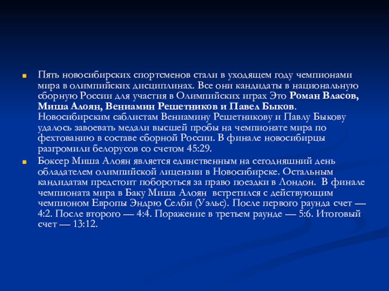 Пять новосибирских спортсменов стали в уходящем году чемпионами мира в олимпийских дисциплинах. Все они кандидаты в национальную сборную России для участия в Олимпийских играх Это Роман Власов, Миша Алоян, Вениамин Решетников и Павел Быков. Новосибирским саблистам Вениамину