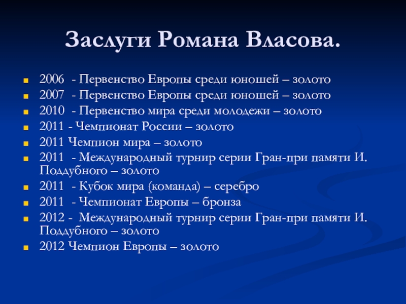Заслуги Романа Власова.2006  - Первенство Европы среди юношей – золото2007  - Первенство Европы среди юношей – золото2010