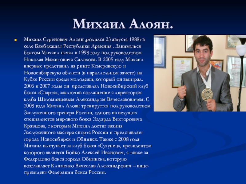 Михаил Алоян.Михаил Суренович Алоян ,родился 23 августа 1988г в селе Бамбакашат Республики Армения . Заниматься боксом Михаил