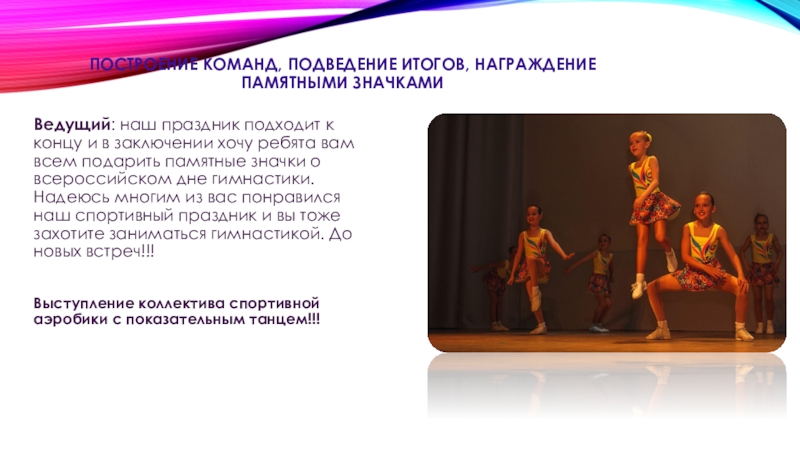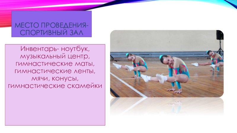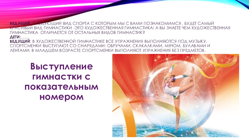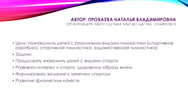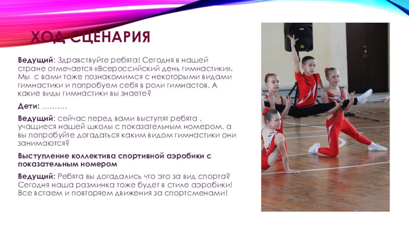 Цель: познакомить детей с различными видами гимнастики (спортивная аэробика, спортивная гимнастика, художественная гимнастика)